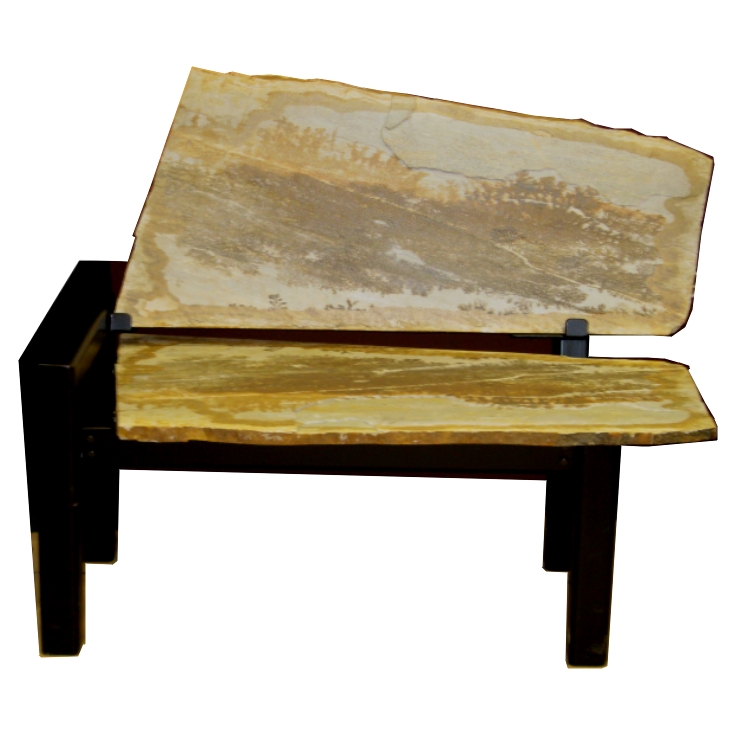 This design was custom made for a recent trade show. It's all about the rock, with the metal lending strong but subtle support which breaks down into four components and the two mirror image flagstones for shipping. See details below.
